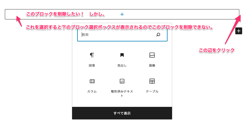 カラムブロックで+ボタンが表示された状態になり、いくら選択しても下図のようにブロックの選択メニューが表示されるだけで、上に表示されるはずのツールバーが出てこない状態になりました。
