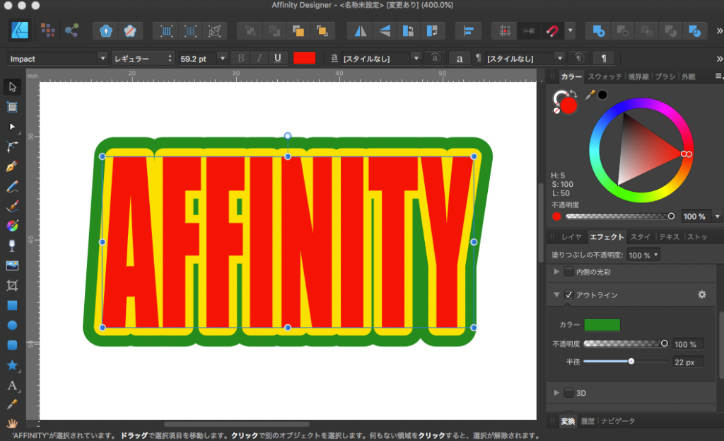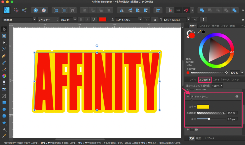 右側のエフェクトタブを選択して、アウトラインにチェックを入れます。半径スライダーで調整します。色も設定出来ます。