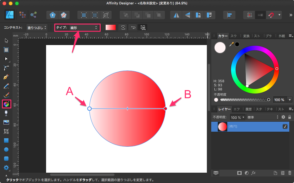 下図のように「線形」を選択するとAとBの丸が表示されます。後はAの色、Bの色を選択するだけです。