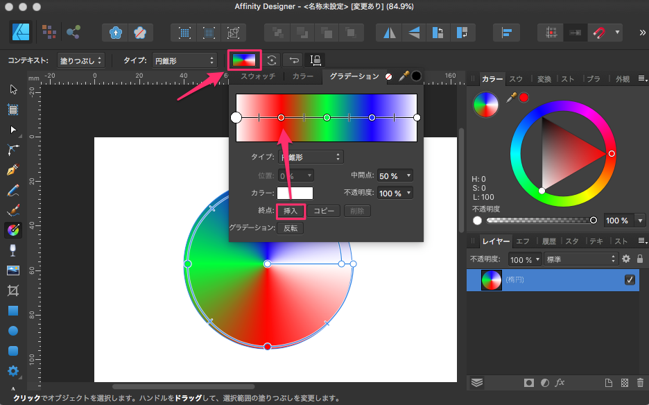 色を色々追加する場合はここから設定できます。挿入をクリックすると円が追加されるので色も追加できます。