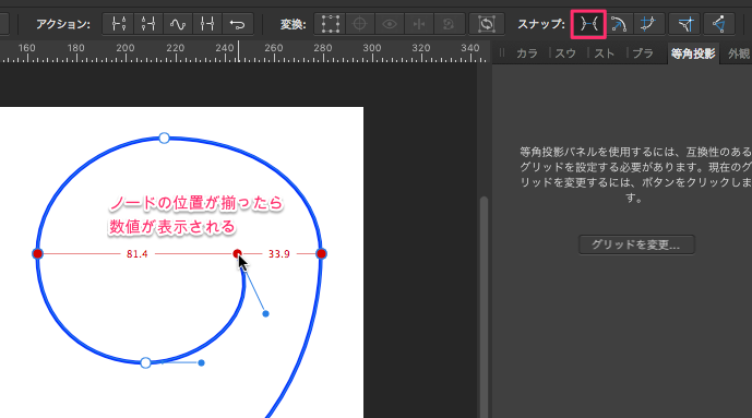 この「作図スナップを実行」とは、異なる方法でこれらのコントロールハンドルを隣接するノードポイントや隣接するコントロールハンドルへスナップさせる機能のことです。チョット説明が難しいですが…