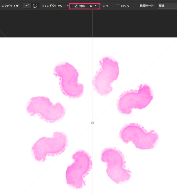 [対称]―0より大きい値に設定すると、いくつかの軸の周囲にブラシストロークが繰り返されます(対称値によって定義される)。中心軸ポイントの位置は、中心軸ポイントをクリックしてドラッグすると変更できます。(対称:1にすると上下同じものが2つできる。下の画像は4にした場合)
