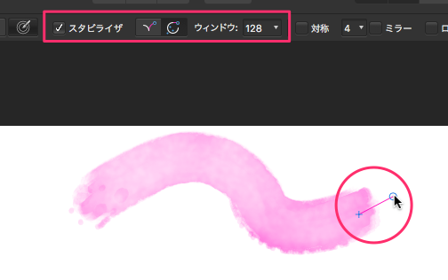 ウィンドウスタビライザは、サイズ可変のウィンドウ内でサンプリングした入力位置を平均化することでストロークを滑らかにします。(スタビライザにチェックを入れ、右のアイコンを選択。上との区別が分かりにくい。ウインドウ:128は数字が大きほど赤ラインが長くなるので大きく円を描く場合いいのかなと思う、サイズ可変のウインドウ内の意味が不明)