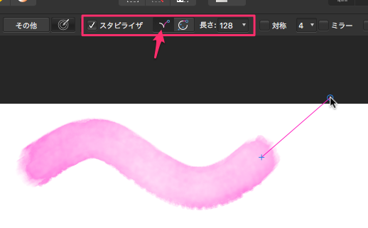 [スタビライザ]―[ロープスタビライザ]または[ウィンドウスタビライザ]モードを使用したストロークのスタビライズを有効にします。ロープスタビライザは、「ロープ」を用いてストロークの端をドラッグし、ストロークを滑らかにします。ロープを緩めて方向を変えることで、長さ(半径)の値を調整しながらシャープコーナーを作成することもできます。(スタビライザにチェックを入れ、左のアイコンを選択、長さは赤のラインの長さ、大きく滑らかなラインを引く場合には大きくするといいかも)