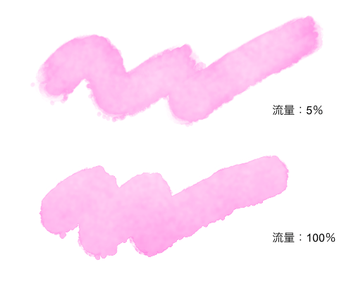 [流量]―ピクセルブラシのエフェクトを適用する速度(1%は非常に遅く、100%は即時)。テキストボックスに直接入力するか、ポップアップスライダーをドラッグして値を設定します。(100%の方が縁がボケない感じ)