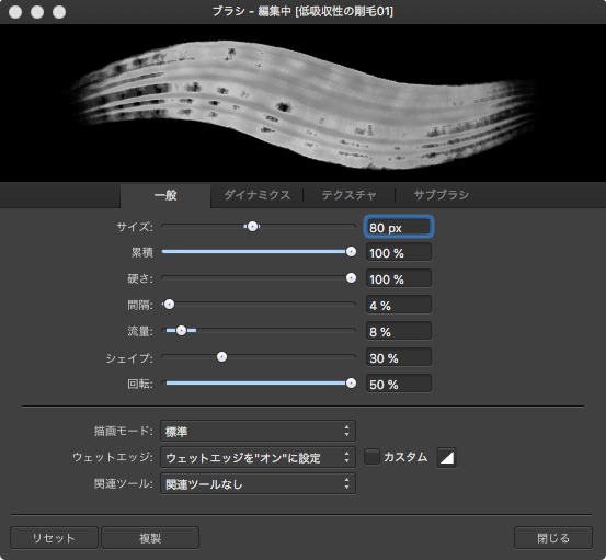 Affinity Photoにはブラシの編集中というウインドウがあります。色んな細かい設定ができるのですが、最初の設定を覚えておくか複製をしておかないと、一度ウインドウを閉じると元には戻りません。
