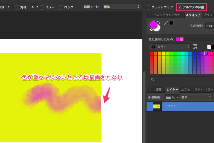 [アルファの保護]―オンにすると、現在のレイヤーの透明領域上(又は白バック)にはペイントできません。このブラシツールは、[ブラシ]パネル内の特定のブラシに関連付けることができます。