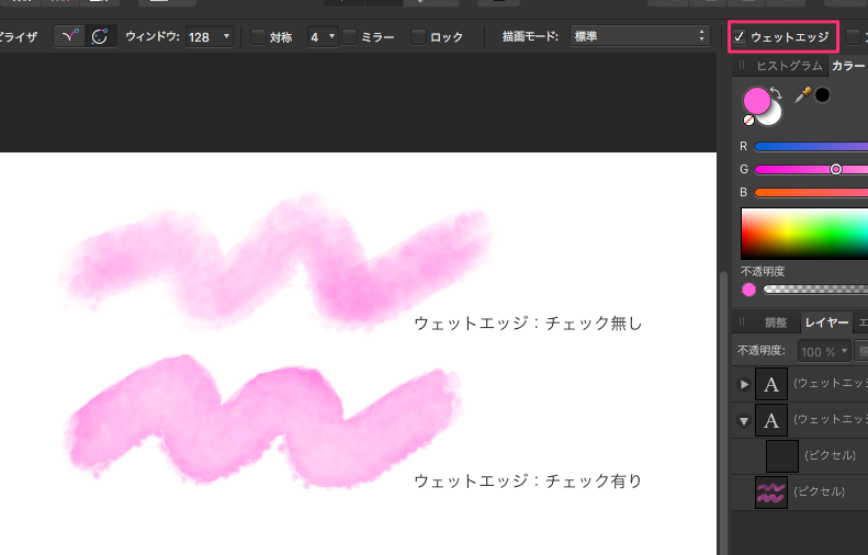 [ウェットエッジ]―塗料はピクセルブラシストロークのエッジに沿って付着し、水彩絵の具のような効果が得られます。(これは結果がはっきりと分かります)