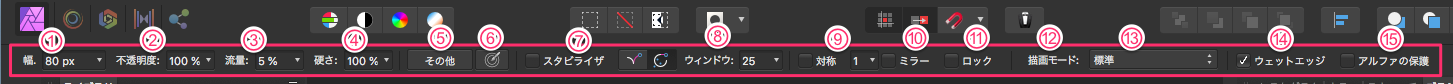 [描画モード]―適用されるピクセルがレイヤー上の既存のピクセルとどのように相互作用するかを変更します。ポップアップメニューから選択します。(レイヤーになって重なった場合のモードを選択する。これレイヤーの方にも同じ描画モードがあるが、どちらが優先なのか?)