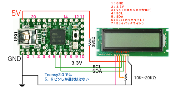 ※Teensy++2.0は、0(SCL)、1(SDA)ピンだけ。
