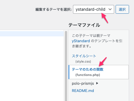外観 -> テーマファイルエディッターからstandard-childを選択して「functions.php」を開く。