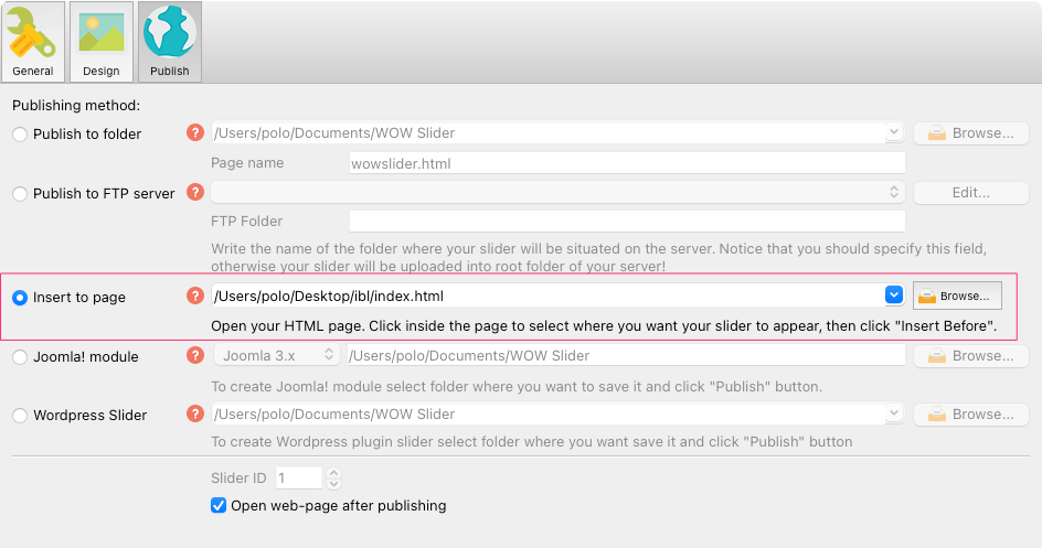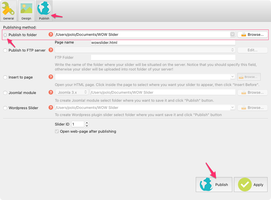 スライダーをオンラインやテスト用ローカルドライブに公開する準備ができたら、”Publish(公開)”へ行き、公開する方法を選択、以下のように3つの選択肢がある: