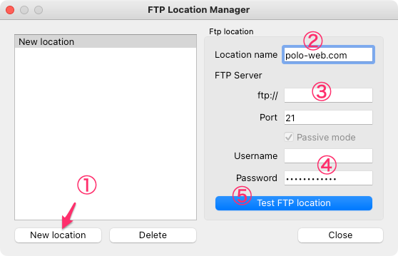 FTPロケーションマネージャーのウィンドウが表示されます。そしてあなたのサイトの有意義な名前(ホスト名ではない)とFTPの詳細を適切な場所に記入します。あなたのホスト名と例えばドメインを記入しなくてはなりません。FTPポートは通常21ポートにありますのですでに記入されているはずです。あなたのウェブサイトが他のポートを使用している場合はそこに記入しなくてはなりません。