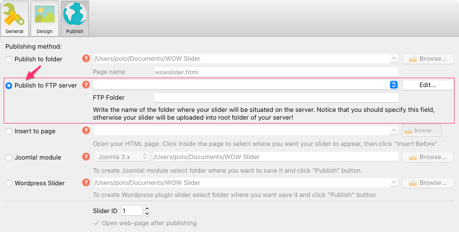 - * FTPサーバーに公開:FTPにあなたの画像スライダーをアップする時に、FTPロケーションマネージャーのウィンドウでいくつかのコネクションを記入することができます。