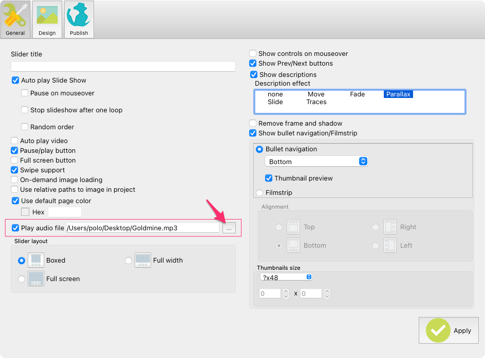 メニューからSlider(スライダー) -> Properpaties(プロパティ) -> General(全般) -> Play audio file(オーディオ ファイルの再生)からmp3ファイルを指定して取り込むことができる。