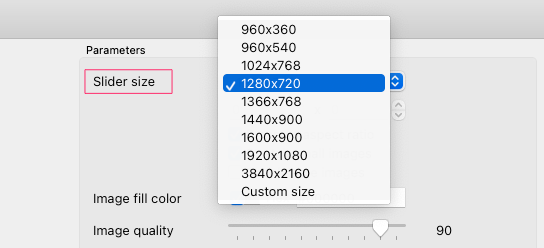 エクスポートする「Slider size 画像」はいろんなサイズの設定が出来ます。入れる画像が小さいのに大きいサイズで書き出しても、ぼやけるだけで意味がないので入れる画像サイズを確認して設定する必要がある。