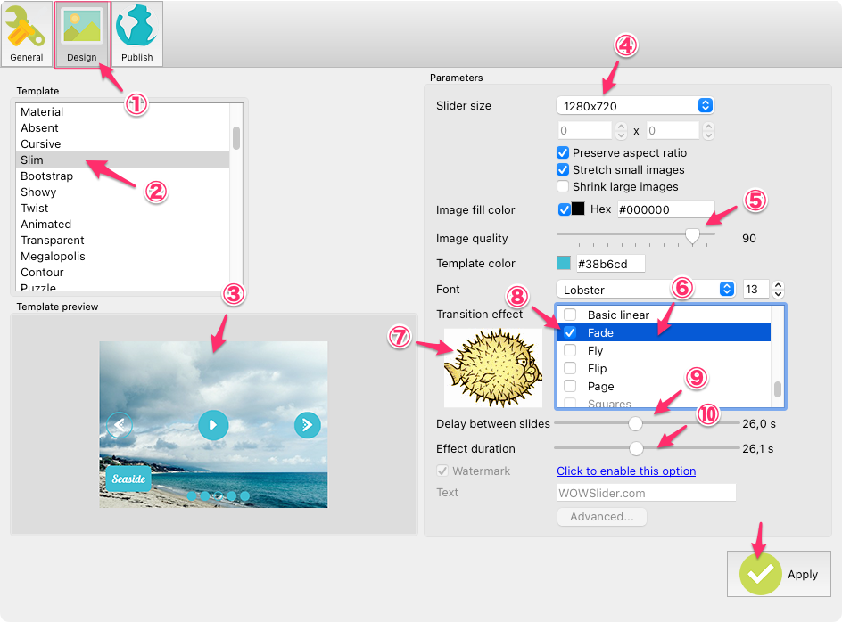 二つ目のタブ①を選択、②でテンプレートを選択、③にそのプレビューが表示される。④画像のサイズと⑤クオリティ、⑥画面切り替え効果の選択、⑨Delay between sliders(画像タイミング)、⑩Effect duration(効果持続時間)を設定できる。