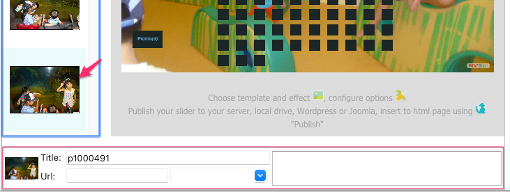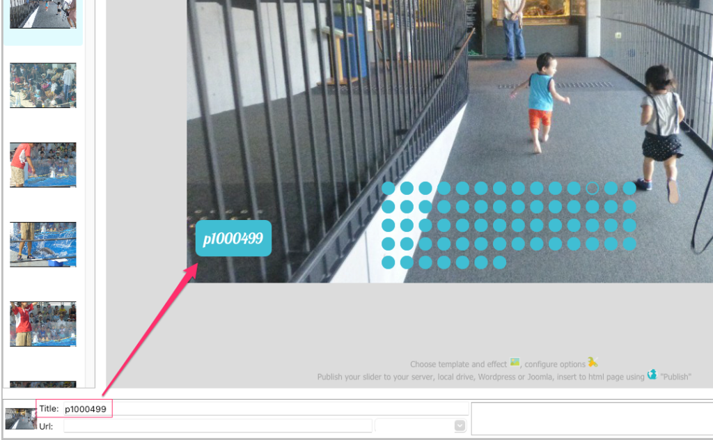 jQueryスライダーに追加したくない画像を入れてしまった場合でも、簡単に削除出来ます。フォトスライダーから削除したい全ての画像を選び、”画像を削除”を画像メニューから(左上の+-ボタン)選択。CTRLを押しながら好きな画像をクリックする事で画像を選択できます。