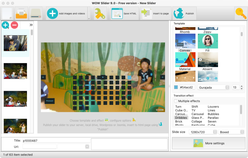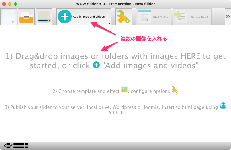 または、WOW画像スライダーウィンドウに画像(フォルダ)をドラッグ出来ます。その画像はピクチャーフォルダにコピーされ、自動でウェブスライダーに追加されます。