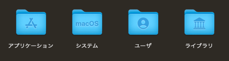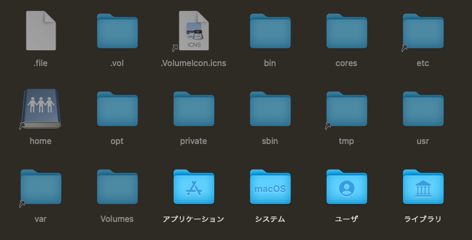「Macintosh HD」OSが入っているディスクを開いて見ると以下の様になっている。