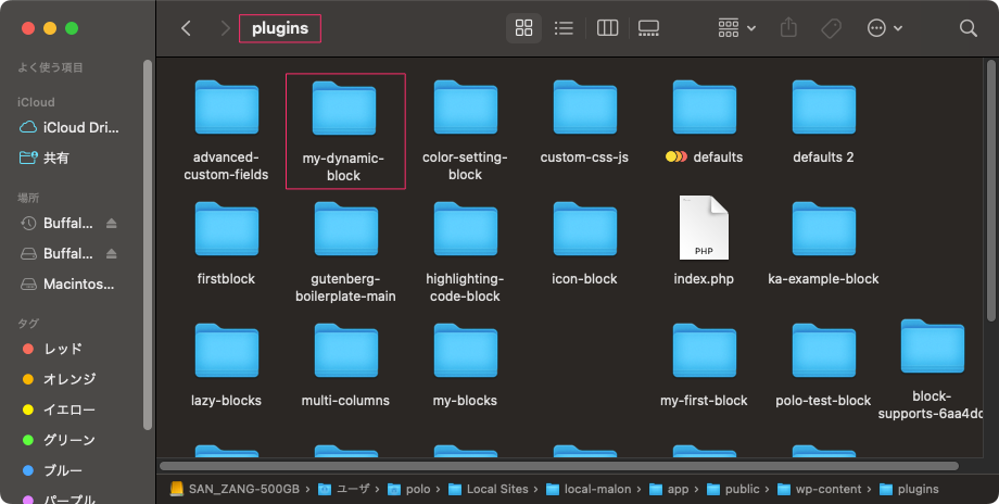 インストールしたら「plugins」フォルダ内に「my-first-block」が出来上がっている。