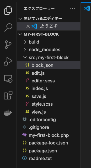 以下が開いた状態、src/my-first-block内が編集に使うファイルになる。