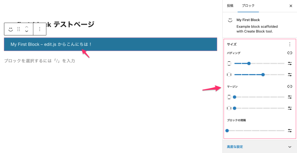 サイドバーに「パディング、マージン、ブロック間隔の設定」を作成する「my-first-block」