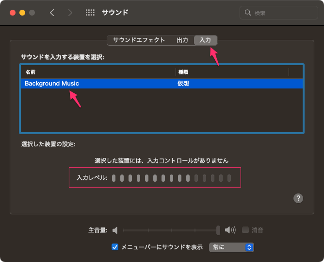 入力は「Background Music」の仮想オーディオを選択することにより内部音声をこれを通して「複数出力装置」に出力することができるようになる。