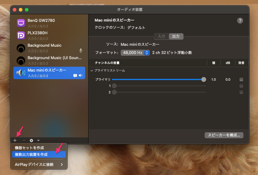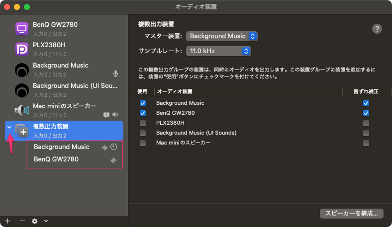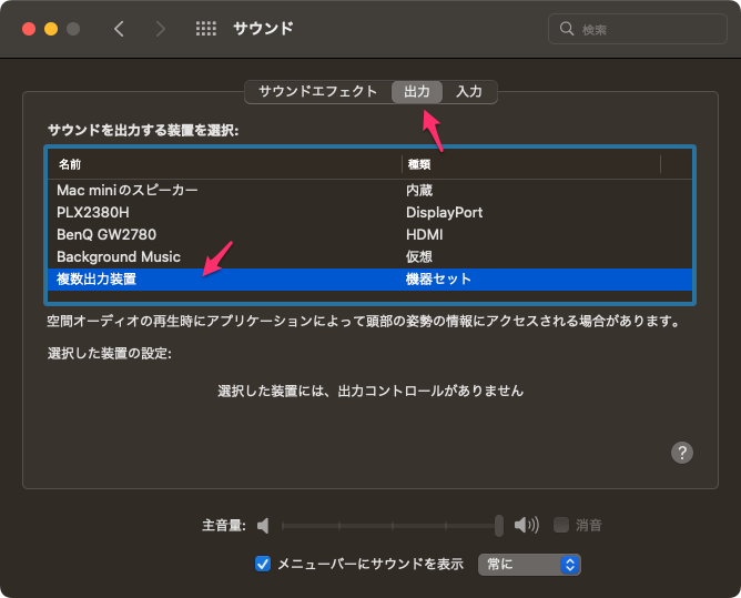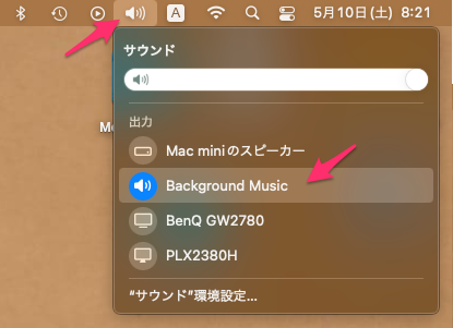 ここでは「BenQ GW2780」はモニターのスピーカーであり、「Background Music」は仮想オーディオになる。
