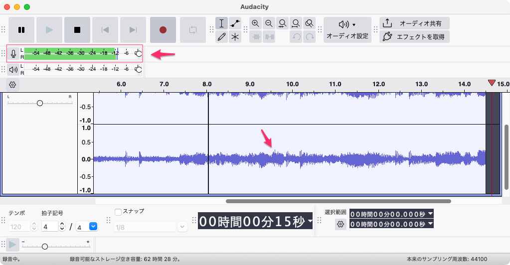 上記の設定でMacから音を出し「Audacity」で赤丸のボタンをクリックし録音を開始すると以下のようにレベルが上がり録音されているのがわかる。