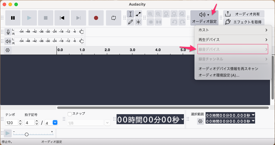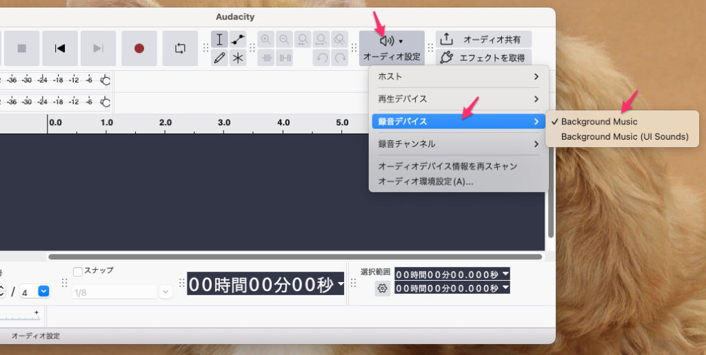 BackgroundMusic のインストールが完了すると「Audacity」で録音デバイスとして確認できるようになる。