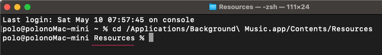 ターミナルで「Resources」フォルダへ移動した状態。