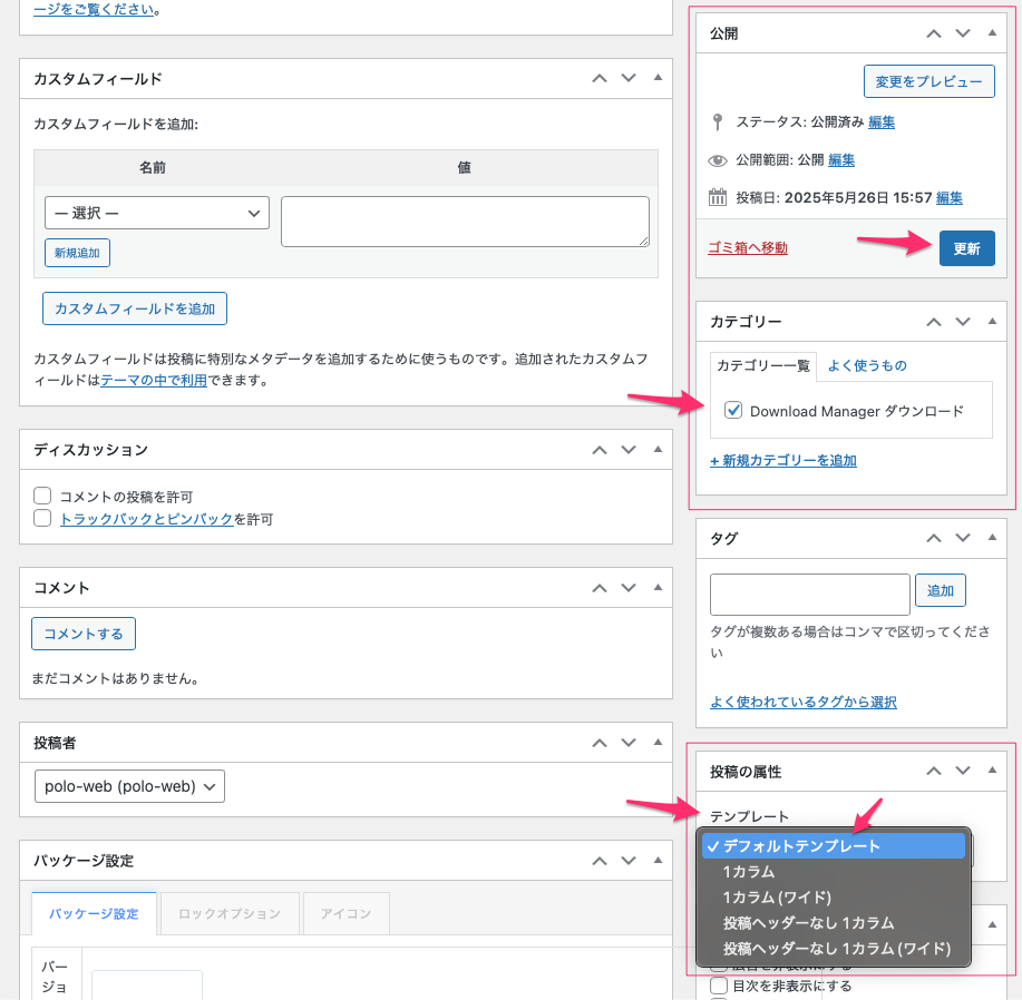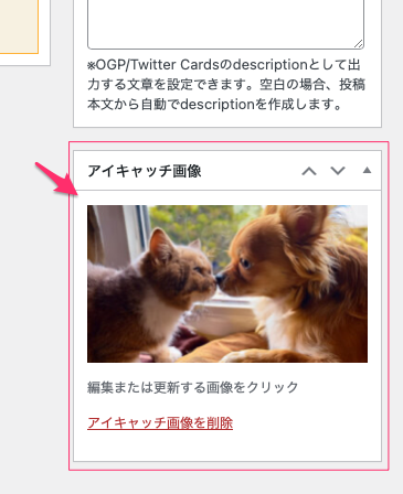 一番右下にアイキャッチ画像の設定がある。上のダウンロードページの見本、①のところに表示される。不要だったら入れなくても良い。
