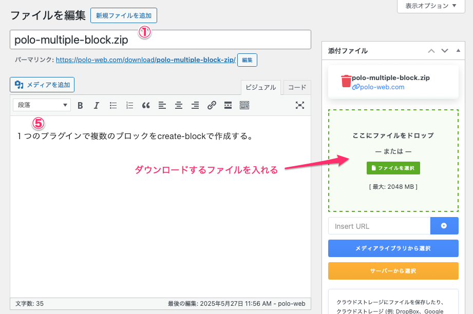 ①タイトルを入れる、右側の「添付ファイル」でダウンロードするファイルをアップロードする、ZIPにすれば問題なくアップロードできる。