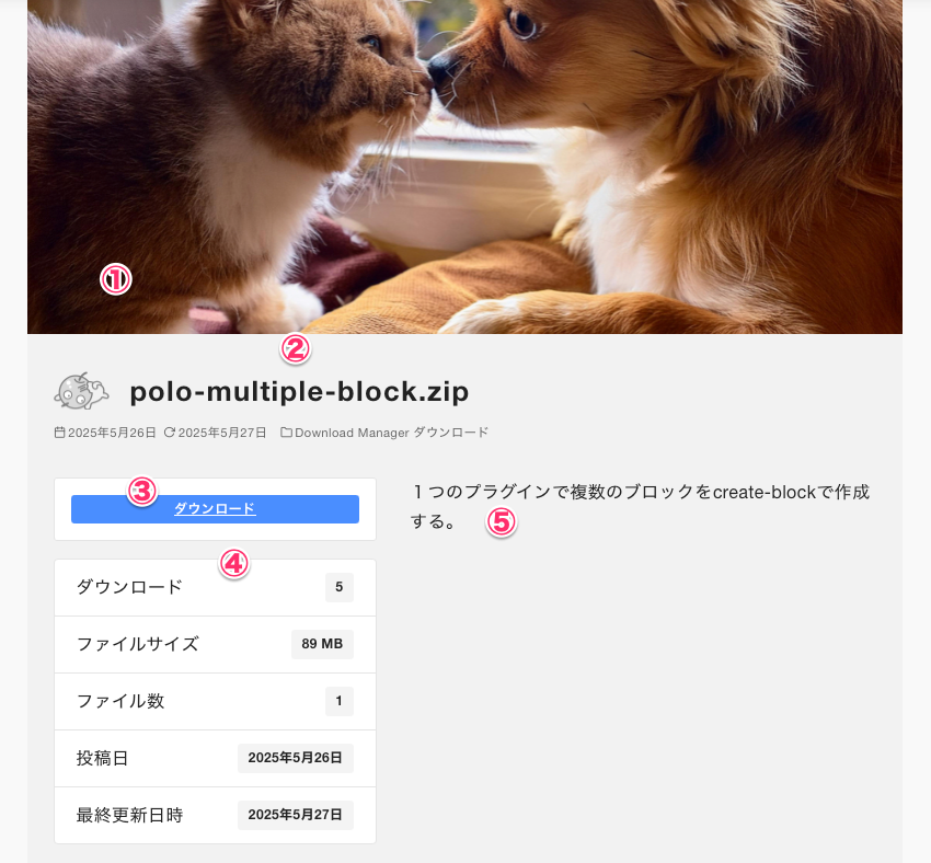 ⑤はダウンロードページの右側に入る説明テキストになる。(上の画像を参照)