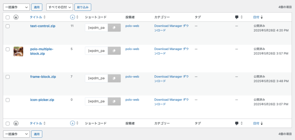 ダウンロード -> すべてのファイル」から設定したタイトルとショートコード、カテゴリーが表示され、それぞれ編集することもできる。