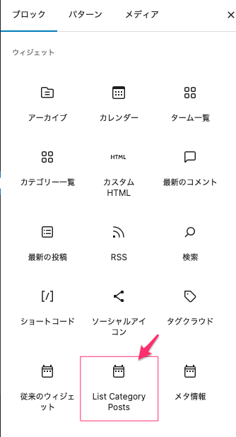 すると、ブロックのウイジェットカテゴリーに以下の項目「List Category Poste」があるはずである。