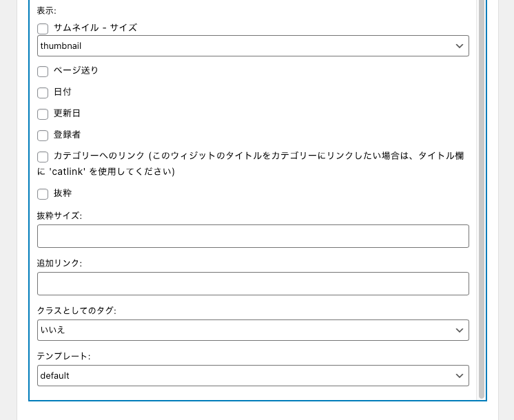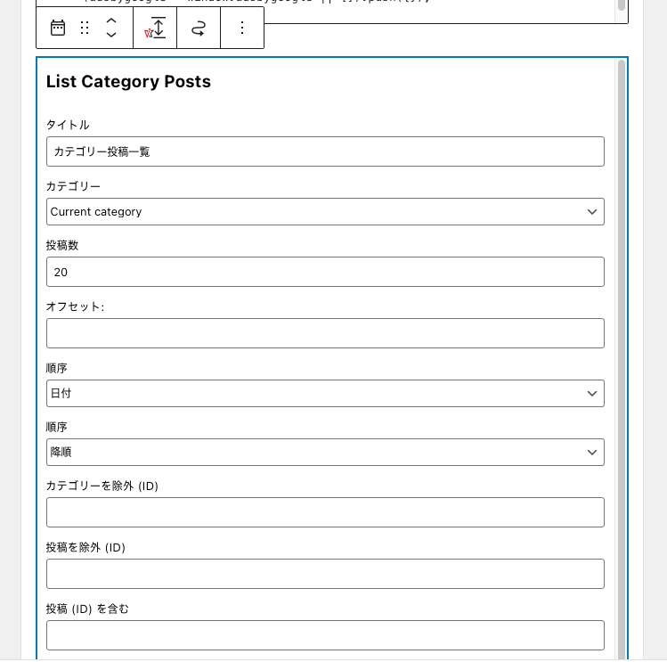 「List Category Poste」ブロックが入ると以下のように表示される。色んな項目が設定ができるようになる。自分の設定は以下の通り。