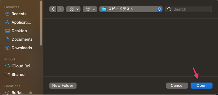 テストしたり場所、ここではDocument(書類)に新しく「スピードテスト」というフォルダを作成して、右下の「Open」をクリックする。