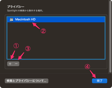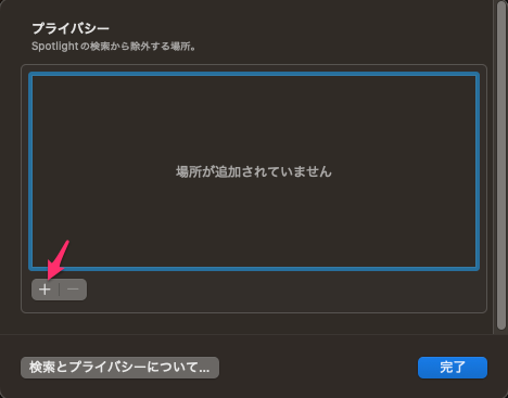 システム設定 -> Spotlight と選択して右下の「検索のプライバシー…」をクリック。