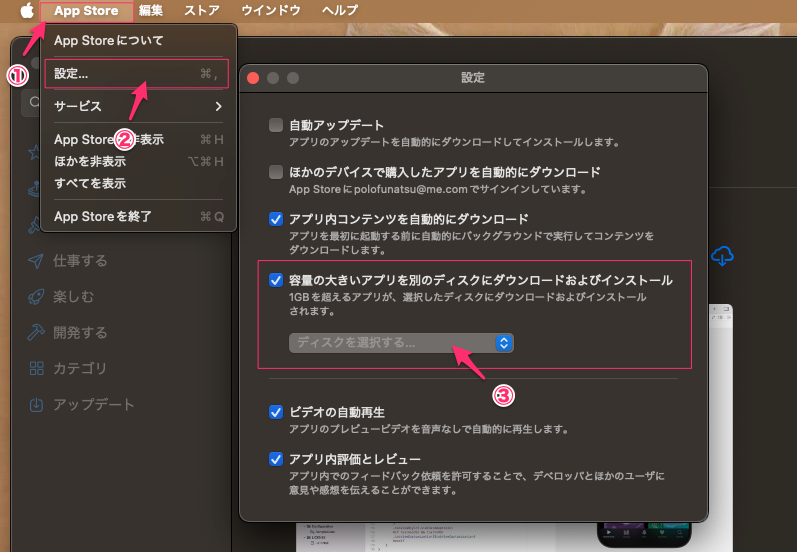 App Storeアプリのメニューバーにある「App Store」->「設定」を開き、「容量の大きいアプリを別のディスクにダウンロードおよびインストール」にチェックを入れ、インストール先の外付けドライブを選択するだけ。