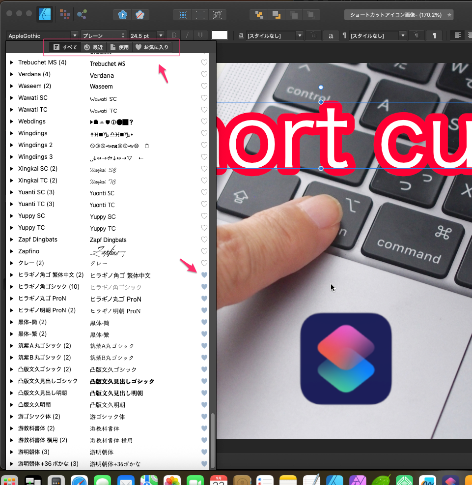 AffinityDesignerやAffinityPhotoのデザインソフトでデフォルトで「すべてのフォント」が選択されているので使わない英語のフォントが大量にリスト表示されていて、探すのに苦労するのが実情です。