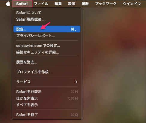 Safariを開き、上部メニューバーの「Safari」から「設定…」を選択。