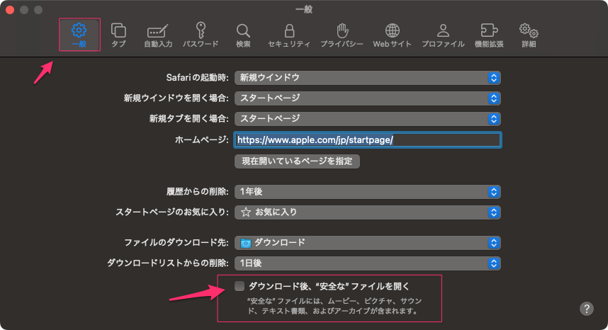 「一般」タブを選択、下部にある「ダウンロード後、”安全な”ファイルを開く」というオプションのチェックを外すだけで完了。