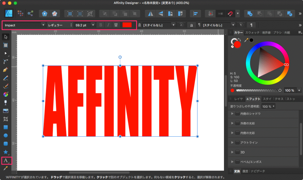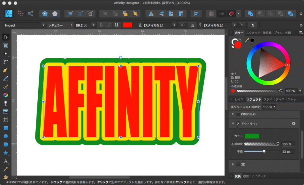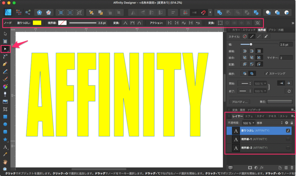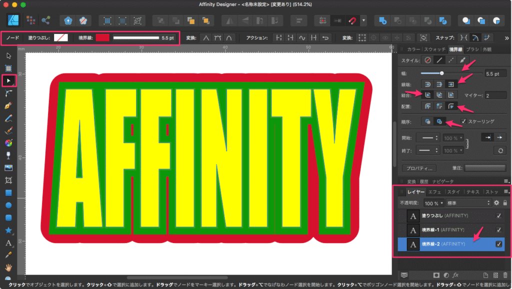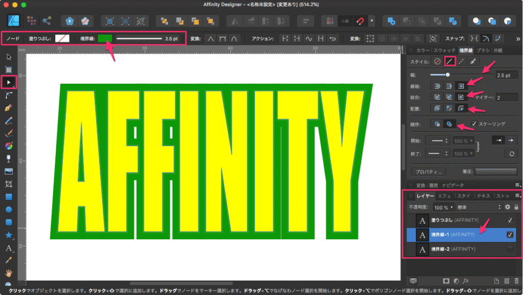 「境界線」パネルで文字の縁取りを設定してみます。ノードツールを選択してコンテキストツールバーから設定する方法でやってみましょう。