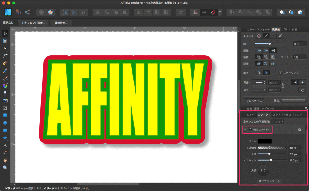 最後に影を付けて完成としました。右下のエフェクトで「外側のシャドウ」を選択して設定しています。