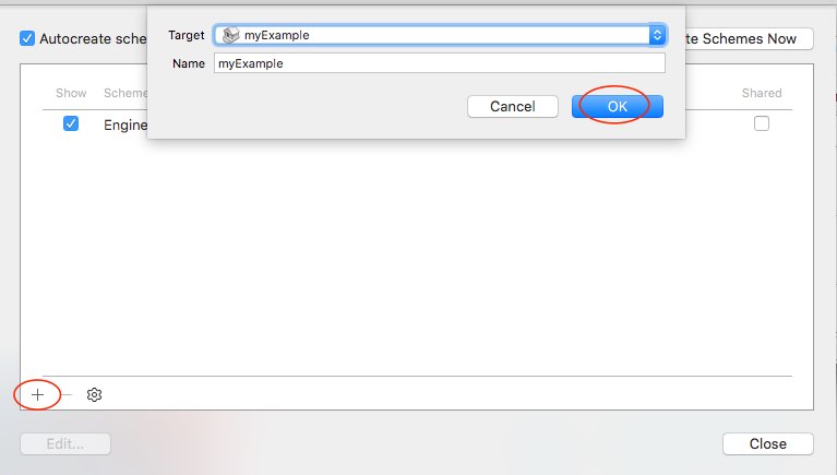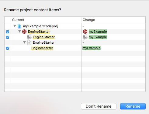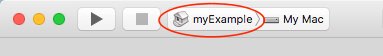 その場合、まずXcodeの開いたプロジェクトで下の楕円のところの名前を変更します。ここでとりあえず「myExample」とします。