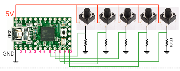 Pushbuttons should be connected between the digital pins and ground.