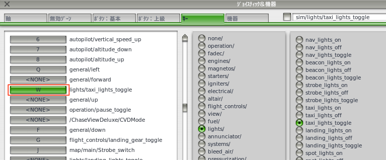 XPlaneを起動、ジョイスティック&機器からどれか下の左の赤枠のように、ボタンを選択してTeensyの「0」ピンに繋いでだプッシュボタンを押すと「W」となります。