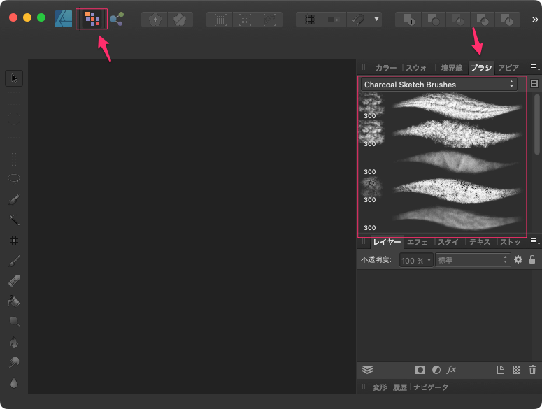 ベクターブラシはAffinity Designerの「左上のアイコン」を選択した場合にインポートした「Vector Charcoal Sketch Brushes」が表示されている。